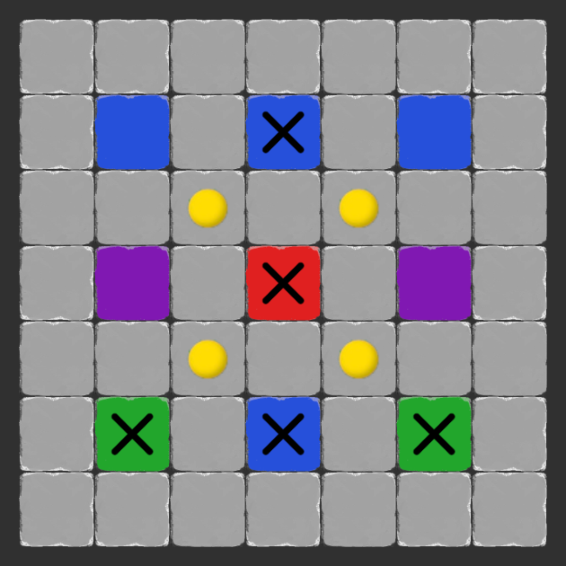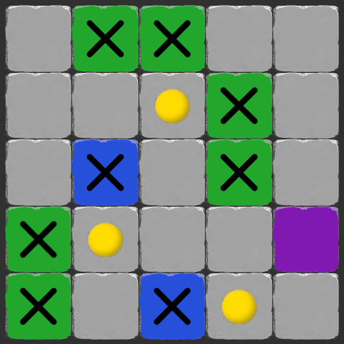 Exactly three tokens around each purple square